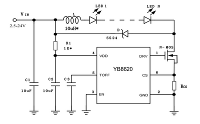 YB8620是一款高效穩(wěn)定的高亮度LED降壓恒流驅(qū)動芯片,內(nèi)置高精度比較器,固定關(guān)斷時間控制電路,恒流驅(qū)動電路等,適合單個或多個大功率LED串并聯(lián)使用YB8620采用固定關(guān)斷時間的峰值電流控制方式,其工作頻率最高可達(dá)1MHz,可使外部電感和濾波電容體積減小,效率提高,節(jié)省PCB面積。在EN端加PWM信號,可調(diào)節(jié)LED燈的亮度。